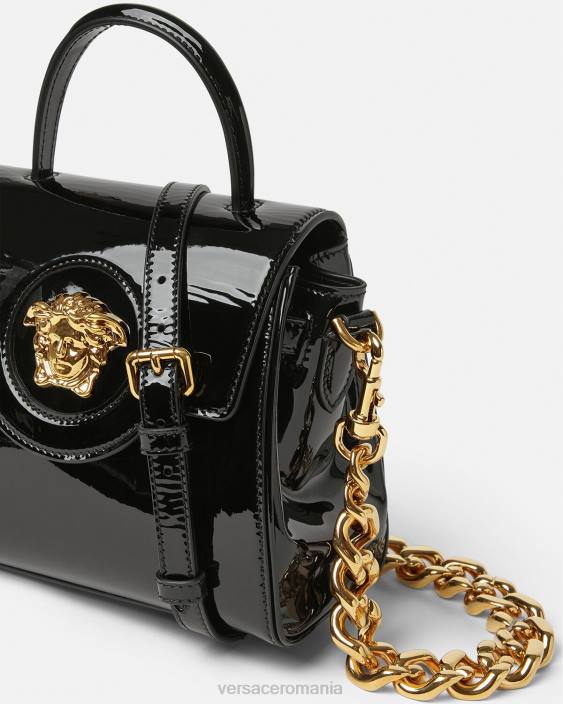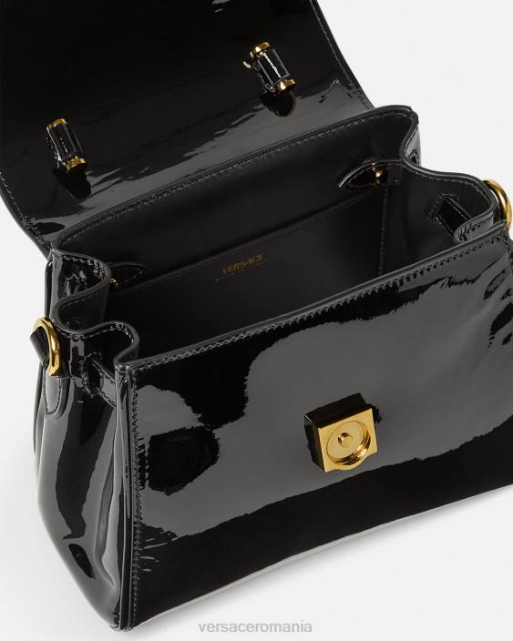 Confecționată în întregime din piele lacuită, geanta de umăr semnătură este împodobită cu o placă cu medusa. stilul versatil poate fi purtat în mână sau purtat în corp de mână folosind lanțul interschimbabil și curelele de umăr din piele.