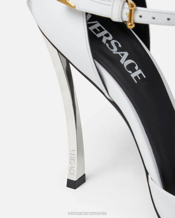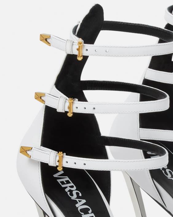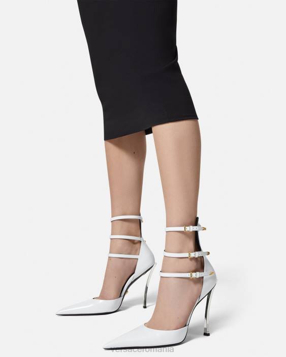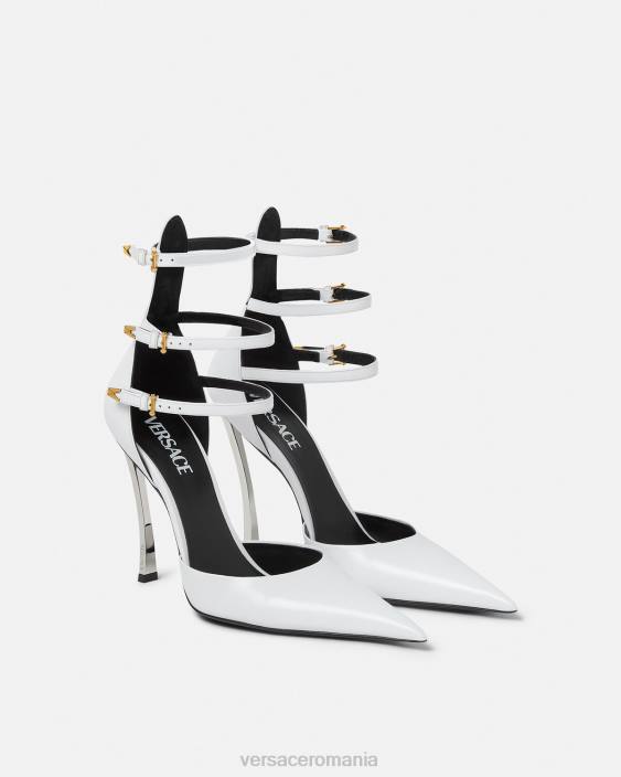 caracterizați prin tocuri stiletto curbate, acești pantofi din piele au degete ascuțite și bretele cu cataramă dublă în față. sunt accentuate de hardware în formă de V.