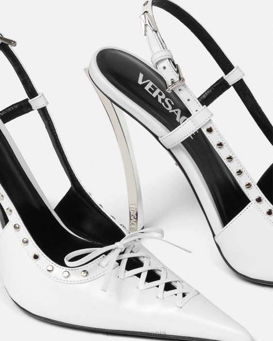 acești pantofi din piele cu slingback se caracterizează prin tocuri stiletto curbate, înalte. având degete ascuțite ascuțite, sunt accentuate de știfturi și detalii cu șireturi pe partea superioară.
