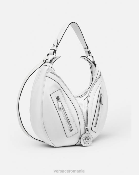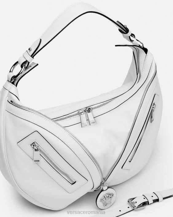 o reediție a unei siluete hobo de arhivă, geanta de umăr repetitivă este realizată din piele italiană suplă, cu o curea de umăr detașabilă. Inspirat de motocicliști, un puller cu farmec cu medusa și fermoarele diagonale adaugă o atitudine grunge cu o margine versace.
