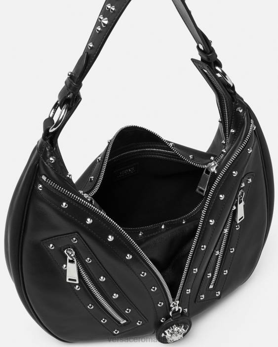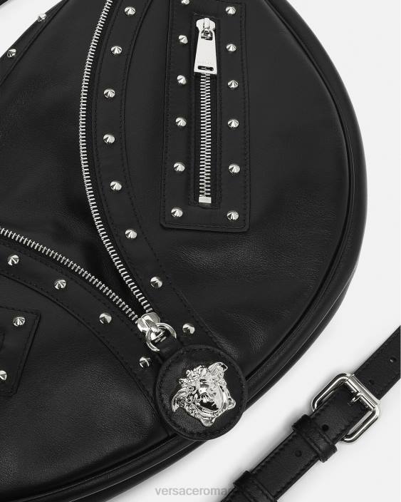 o reediție a unei siluete hobo de arhivă, geanta de umăr repetitivă este realizată din piele italiană suplă, cu o curea de umăr detașabilă. Inspirat de motocicliști, un puller cu farmec cu medusa și fermoarele diagonale adaugă o atitudine grunge cu o margine versace.