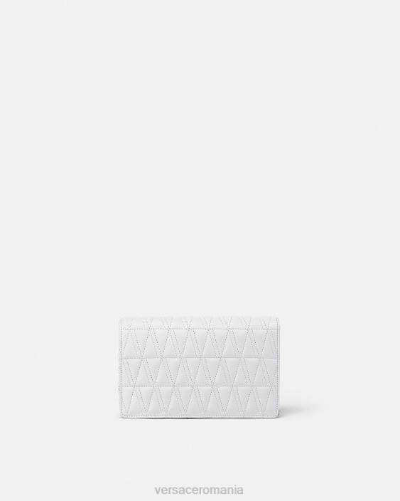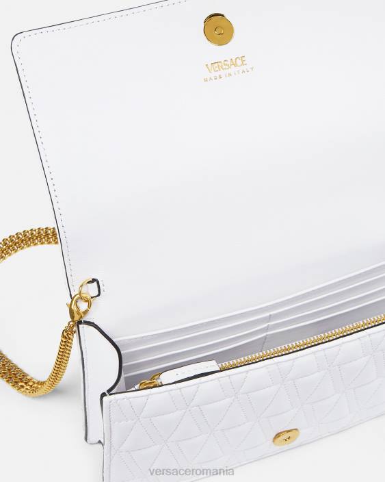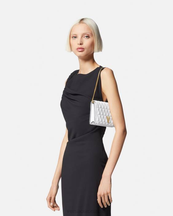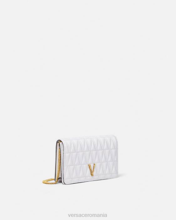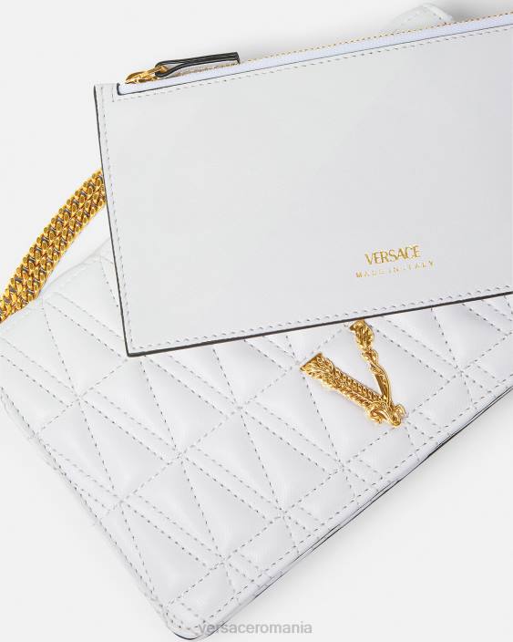 Confecționat din piele cu un model în V matlasat, clutchul virtus prezintă un V barocco cu detalii de frunze de acant gravate și închidere cu clapă magnetică. geanta mică de seară poate fi ținută în mână sau suspendată de un lanț subțire, detașabil.