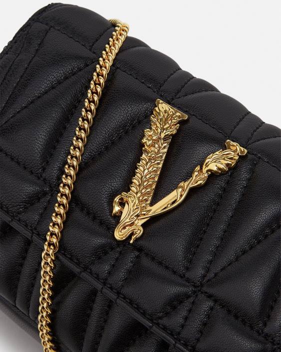Confecționată din piele italiană matlasată într-un model în V, geanta mini virtus are feronerie barocco v cu închidere cu clapă magnetică, cu o curea de lant de umăr, sloturi interne plate pentru carduri și căptușeală cu imprimeu barocco.