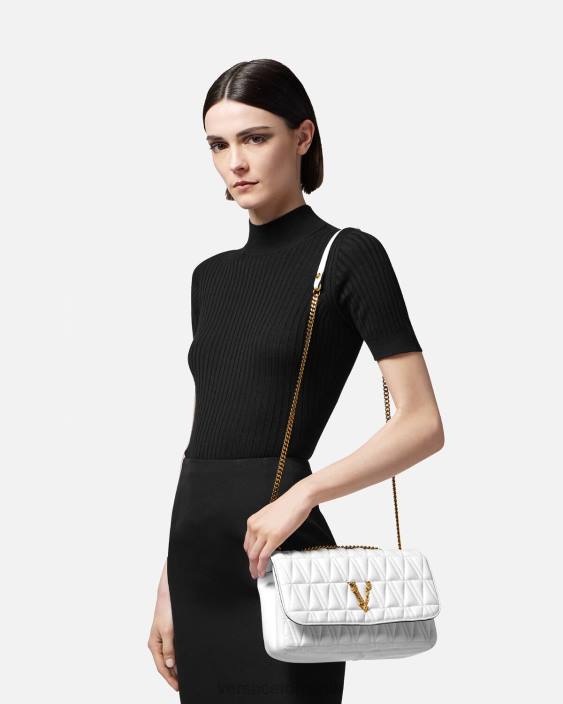 Luând numele de la zeitatea romană a virtuții și a vitejii, geanta de umăr virtus este împodobită cu feronerie emblematică barocco v. Confecționat dintr-o piele suplă de miel matlasată în formă de V, stilul elegant are căptușeală cu imprimeu barocco.