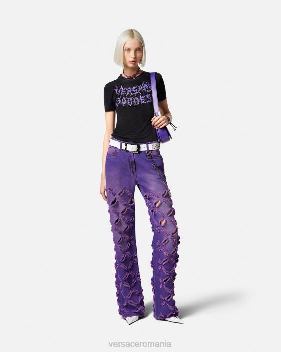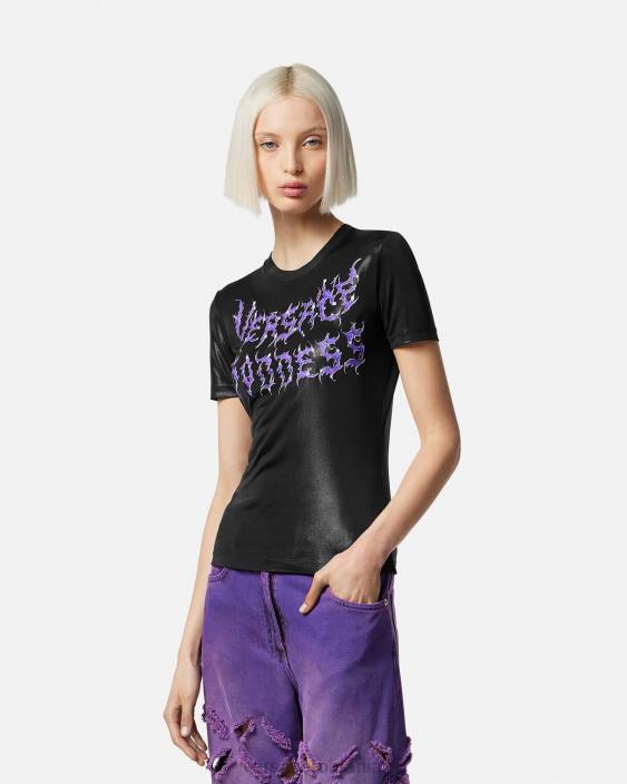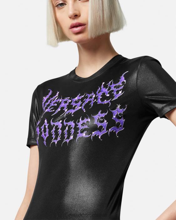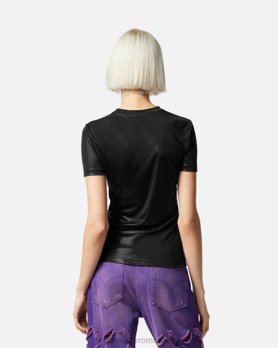 un tricou din jerseu lichid cu mâneci scurte, croit într-o croială subțire și cu logo-ul „zeiței Versace” aprins în față pentru o margine grunge versace.